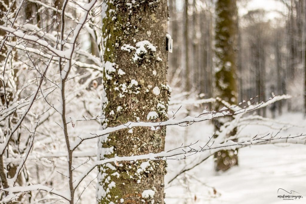 Nous entamons la descente, je ne suis même pas à la moitié de la consommation de ma batterie. Pourtant, le froid accélère la consommation. Le guide me dit de faire attention aux racines, cachées sous les feuilles mortes, elles mêmes cachées sous la neige. Effectivement, en descendant la neige est moins épaisse. J’aperçois les feuilles mortes, mais absolument pas les racines glissantes.