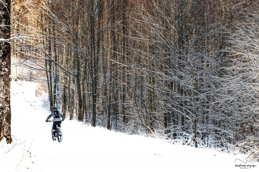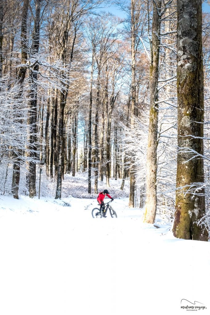 La semaine dernière je vous parlais de ma première sortie sur un VTT électrique dans le Massif des Vosges en Alsace. Aujourd’hui, je vous raconte ma première randonnée à VTT électrique, cette fois-ci, sur la neige ! Pour ne rien vous cacher, je suis comme une gamine au moment où je vous parle, car j’ai toujours rêvé d’essayer ce type d’aventure insolite. Les conditions sont idéales pour une débutante comme moi. L’enneigement est léger, avec une petite dizaine de centimètres. Alors, c’est parti, j’y vais !