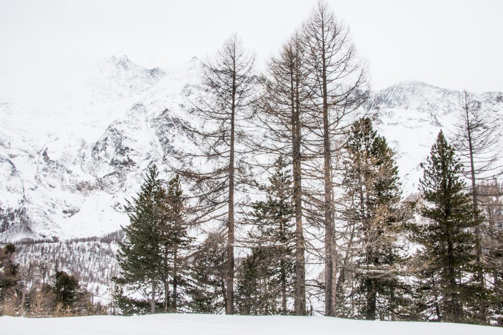 A part nous, il n’y a personne ! Pas un bruit, c’est le silence absolu. Je respire au plus profond de moi-même plusieurs fois ! J’avale ce grand bol d’air pur, qui me rappelle combien j’ai de la chance d’être ici. De profiter de cet instant unique. Les arbres et les roches sont tous vêtus de blanc. Les paysages sont tout à fait splendides. Pour mes débuts en ski de randonnée en Suisse à Saas-Fee, je trouve que ça commence plutôt bien !