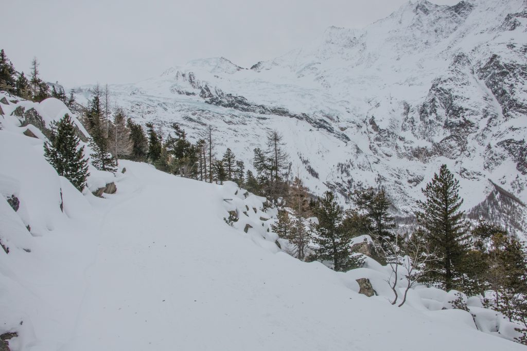 Au fur-et-à-mesure, le dénivelé se fait un peu plus ressentir. Nous moutons en altitude, le souffle se trouve plus difficilement . Ca tire un peu à l’arrière des jambes. Mais rien d’inconfortable ni d’anormal. Je suis sur un chemin relativement étroit. Sur ma gauche, je contemple la petite station de Saas-Fee. Sur ma droite, je suis face à un pan de montagne. A celle qui m’attend au prochain virage.