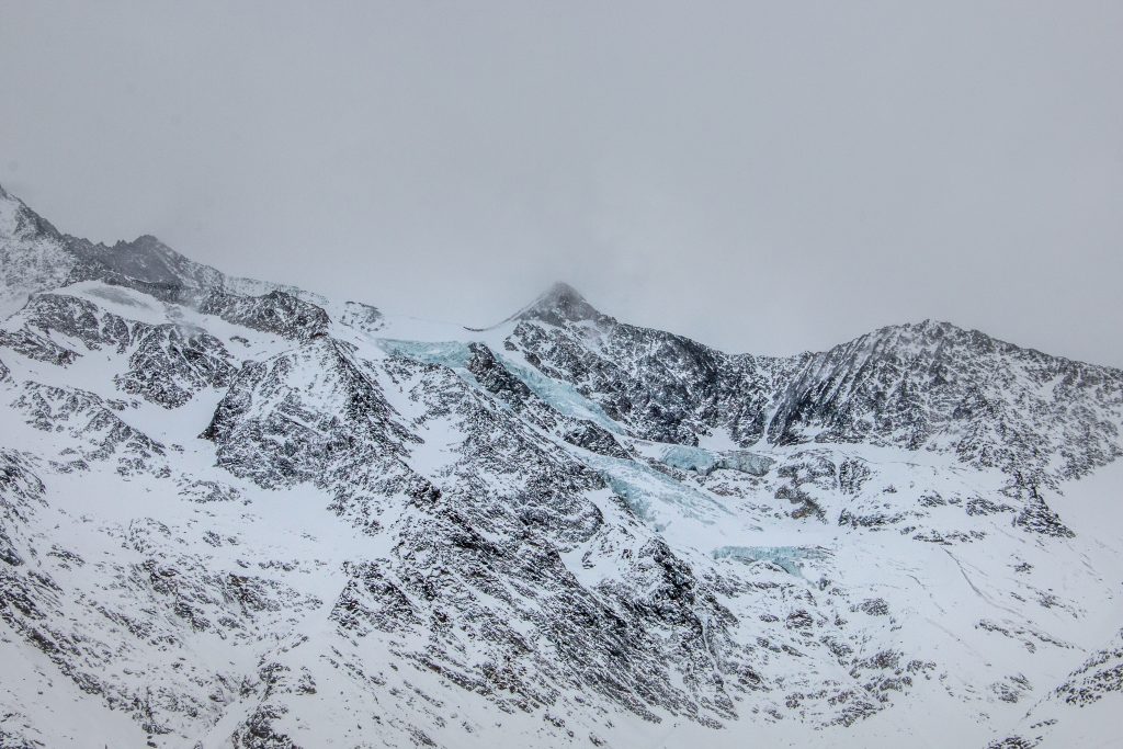 Dans le dernier virage, je tourne la tête à droite et là, je vois mon fameux glacier bleuté. Waouuuuh ! Bouche-bée devant cette beauté, je reste quelques instants à la photographier avec mes yeux, sans bouger. J’observe les moindres rochers attenants. Je sors mon appareil photo pour immortaliser l’instant. Le ciel s’est noircit légèrement. L’ambiance est changeante, voir intimidante. En contrebas, je vois s’éloigner le village de Saas-Fee. Cette ville, devient peu à peu un hameau de chalets, perdu entre deux montagnes.