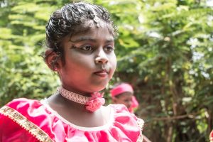 Après 3h de bus de Strasbourg à Francfort, 6h d’avion de Francfort à Bahrein, 3h de transfert dans l’aéroport, 6h d’avion de Bahrein à Colombo, 2h d’attente pour faire la déclaration de perte d’une de nos valises (qui a été retrouvée !), 1h de négociation avec les locaux pour faire passer les sets de badminton supplémentaires, une dernière heure de trajet pour arriver dans le village de Vithialya, le bus s’arrête et là… Surprise générale ! Des dizaines d’enfants en costumes traditionnels nous attendent au pied du bus, pour nous accompagner en musique jusqu’à l’école. Les costumes sont colorés et la musique bat son plein. Les adolescentes nous accueillent avec un large sourire. Je les sens à l’aise et fière de nous faire partager leurs belles coutumes. Alors que les jeunes filles sont beaucoup plus réservées, certainement moins habituées, je les voient se concentrer pour donner le meilleur d’elles mêmes. J’admire leurs coiffures et leurs maquillages amoureusement préparés par leurs mamans respectives.